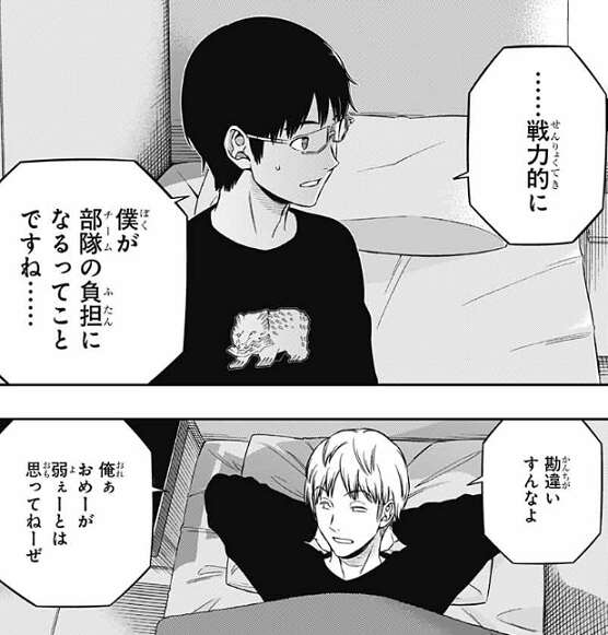 諏訪の就寝前の話ですが、三雲に対するアドバイスが中心でした。2日目以降の戦闘シミュ演習で、三雲が足を引っ張りそうなので、そのフォローを諏訪はちゃんとしています。年長者だけあって、この辺のフォローはきちんとしています。