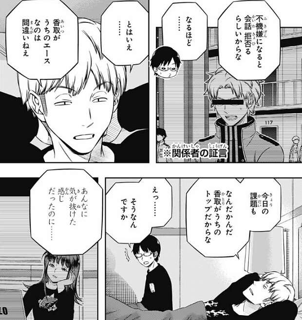 本当に香取が怒って不機嫌になると、会話を拒否るらしいからな、と諏訪は言うと、なるほど……、と三雲は納得します。どうやら諏訪は若村から、事前に香取の事を聞いていたようです。しかし、香取が諏訪7番隊のエースなのは間違いなく、今日の課題も香取がうちのトップだった、と諏訪は三雲に言います。三雲は香取が課題をこなしているとき、気が抜けた感じだったのを見ていたので、意外に感じます。また、オペレーターの宇井は献立作りに時間を使ったので、その分が無ければ課題の得点は香取とトントンになるようです。