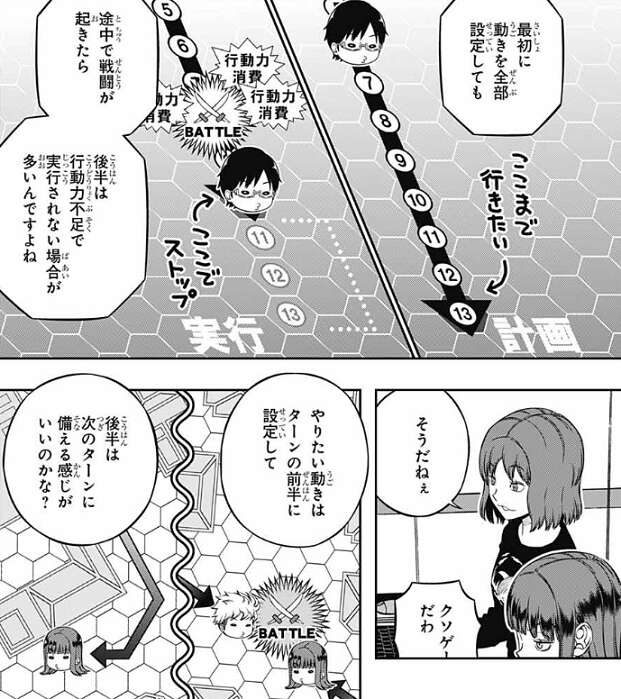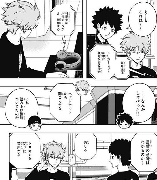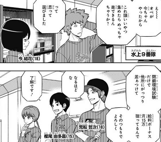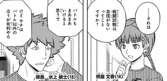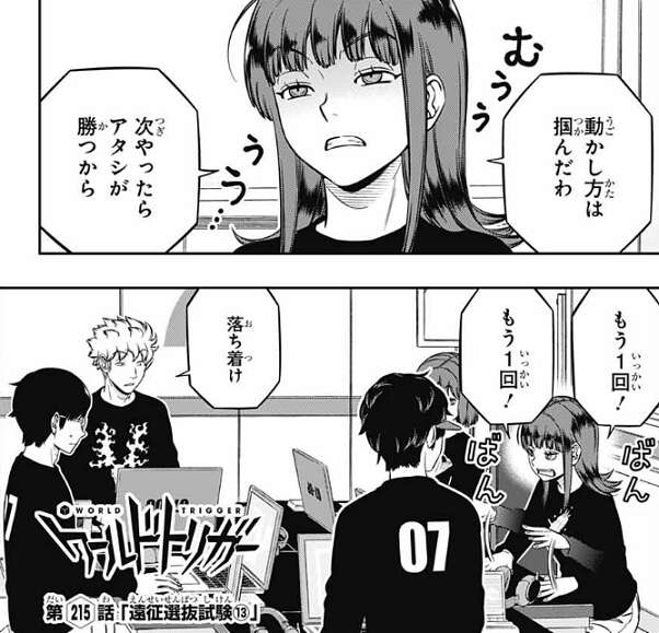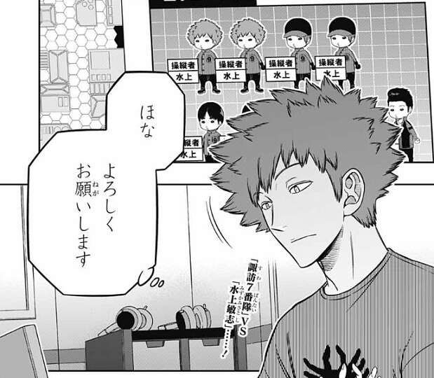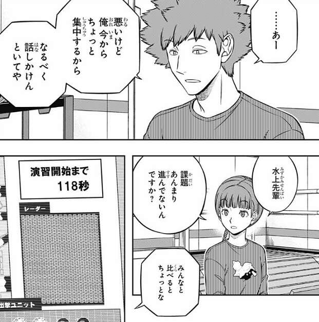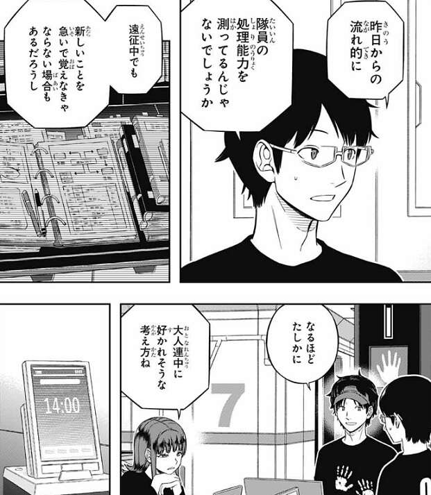 三雲は、昨日の流れ的に、隊員の処理能力を測ってるんじゃないでしょうか、と意見を言います。遠征中でも新しいことを急いで覚える必要もあるから、と三雲が続けて言うと、隠岐は納得しますが、香取は大人連中に好かれそうな考え方ね、とトゲのある言い方をして三雲に絡みます。14時になると今日の対戦順が届き、1試合目は水上9番隊との対戦だと判明します。