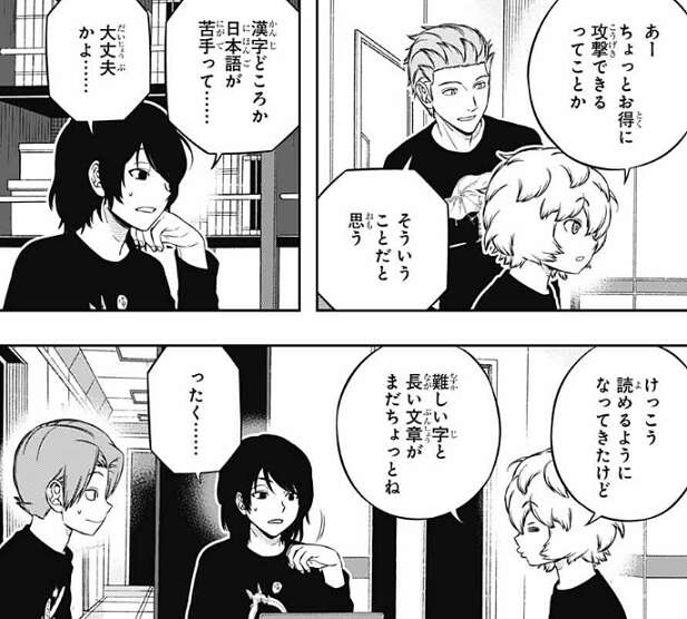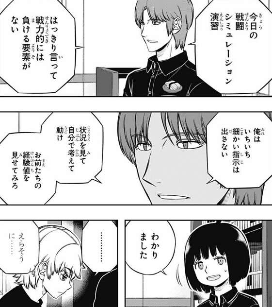 諏訪7番隊を採点していた太刀川や出水は、諏訪7番隊が課題を始めてしまい、することがなくなってしまいます。橘高 羽矢に聞いて、担当以外のチームを見ることができると知り、歌川1番隊の様子を見ます。歌川1番隊では、歌川が空閑に戦闘シミュのルールを説明しています。空閑は日本語が苦手という事で文章を説明してあげていますが、漆間が空閑にあきれています。しかし空閑は戦闘シミュレーション演習の説明をしてもらい手応えを感じたのか、こういうの得意だと思う、と漆間に言います。