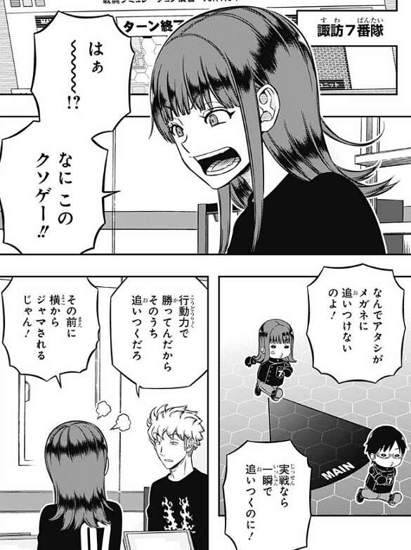 諏訪7番隊では、戦闘シミュレーション演習の練習試合を再開していますが、香取は思ったようにユニットが動かないようで、はぁ~!?なに このクソゲー!!と、思いっきり激怒しています。攻撃や防御など行動には、それぞれ決まった待ち時間があるようですが、そのたびにユニットの動きが止まることに香取はイライラしているようです。他にも防御にも待ち時間があるようで、隠岐は弾トリガーで囲んで撃ちまくったら、強い相手も足止めできるのでは?と、意見を言います。