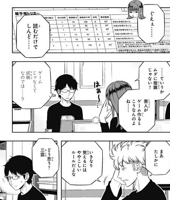 香取は、ルールの設定や、無駄に複雑なソフトの作りに大いに不満があるようで、素人がゲーム作るとこうなんのよね……、と大きなため息をつきます。ゲームじゃなくてテストなのでは……?と、三雲は心の中でツッコミますが、いきなり覚えるにはややこしいルールだよな、と諏訪は言うと、三雲にどう思うか質問します。