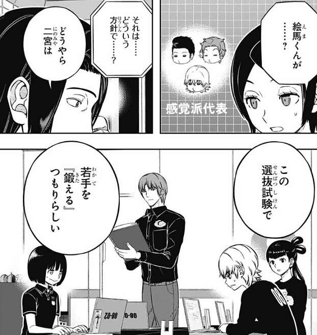 木虎は東の考えを聞き自分の点数に納得し、地に足をつけて『次』に臨める、と東に言います。東は400字以内という条件で考えればお手本レベルの答案だと木虎を褒めますが、それでも木虎は400字という条件から無意識に逆算して「ほどよくまとまった答え」で満足してしまったとも言える……、と考え、やはり木虎は自分の解答に満足しません。さらに東が二宮8番隊の特別課題は二宮の指名で絵馬がやったと木虎に教えると、木虎は感覚派代表の絵馬が担当したことに驚きます。東は二宮が選抜試験で若手を鍛えるつもりだと、自分の考えを木虎に伝えます。