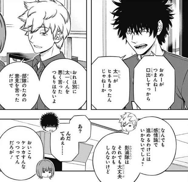 別役がヒネてしまった原因は犬飼にあると責める影浦ですが、別に別役を悪く言ったつもりはなく、チームのための意見を言っただけ、と犬飼は影浦に反論します。さらに、なんでも感情論で進めるわけにはいかないでしょ?影浦隊はそれでも大丈夫なのかもしれないけど、と犬飼は言い影浦を煽る形になってしまい、藤丸がケンカすんなと二人を注意します。