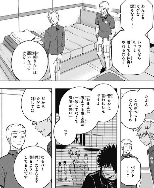 ベッドのある部屋に戻った柿崎は犬飼に、あんまりカゲを煽るなよ……、と注意しますが、犬飼はたぶんこれがベストなんですよ、と柿崎に答えます。犬飼は以前、影浦から考えている事と顔が一致しなくて気持ち悪いと言われており、なるべく思ったまんまを喋るようにしている、と犬飼は柿崎に言います。