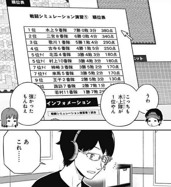 物語の中心となる諏訪7番隊では、水上が1人で戦闘シミュをしている事に隠岐が気付きました。3日目は戦闘シミュの得点が倍になるので、戦闘シミュの結果はさらに重要になります。諏訪7番隊はどのような戦術をとるでしょうか?水上と同じように1人で操作する戦術を採用するのか?今まで通り全員で操作するのか?今後の展開に注目です。