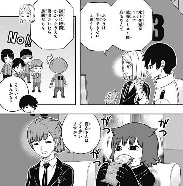 水上が1人で戦闘シミュ1位を取れるなんて、ふつうは予想できないと思うし……、説得に時間かかったうえで否決された最悪だもん、と結束は尼倉に考えを伝えます。しかし尼倉は、そういうもんかな?と、イマイチ納得出来ていないようです。加古隊のオペレーターの小早川杏は、同じ加古隊の喜多川真衣にどう思うか、意見を聞きます。