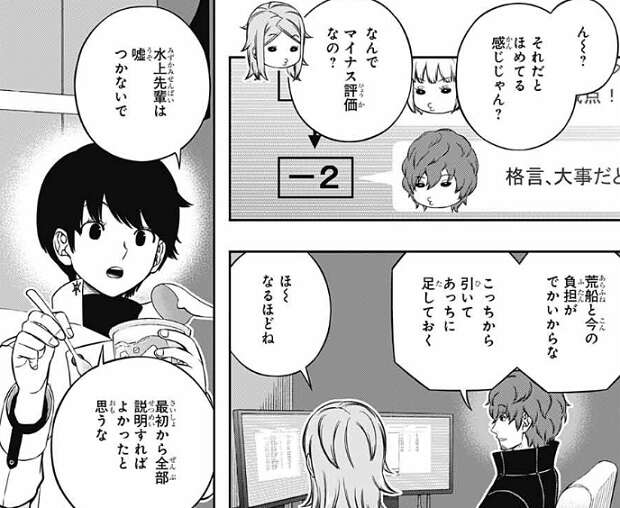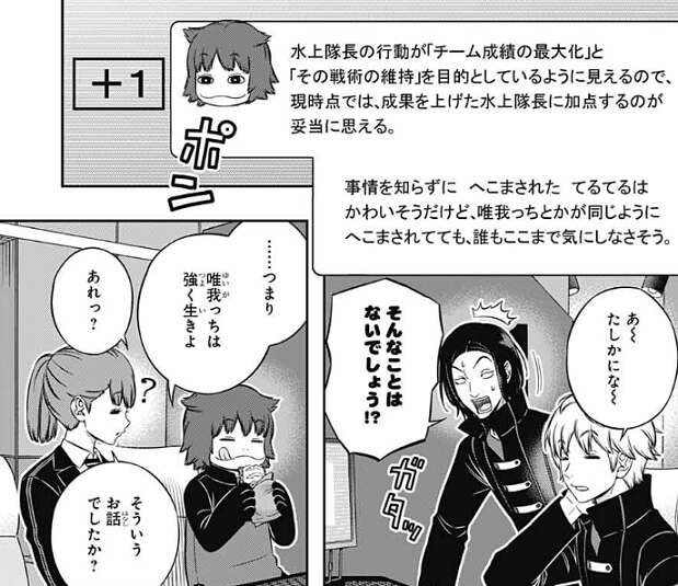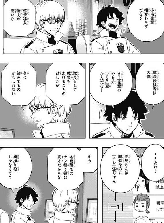 太刀川も『ナシ』派の意見で、水上は揉め事を自分で起こしている分先の予測は出来ていて、隊長をクビになっても荒船を保険としている、と国近に言います。国近は、それだとほめている感じじゃん?なんでマイナス評価なの?と、太刀川に聞くと、荒船と今の負担がでかいから、とマイナスにしている理由を話します。片桐隊の尼倉亜澄は、水上は嘘をつかないで、最初から全部説明すればよかったと思うな、と言いますが、片桐隊のオペレーターの結束夏凛は、私が照屋の立場だったら、簡単には納得できない気がするから、伏せるのもアリだと思う、と答えます。