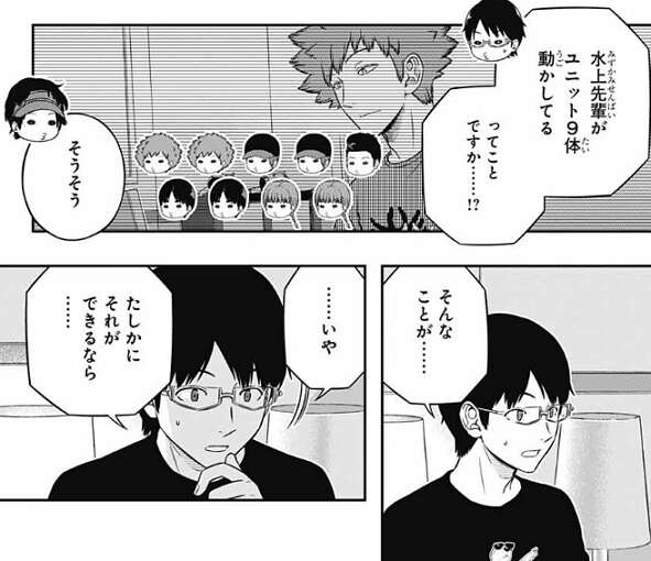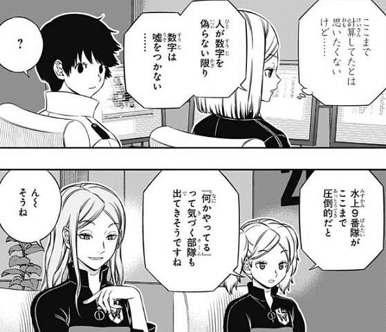 隠岐から、水上が戦闘シミュを1人でやっていると聞き、最初は否定的に考えていた三雲ですが、それなら水上9番隊の異様なほど統制のとれた動きにも説明がつく……、と考えます。それになにより、水上が1人で戦闘シミュをやっている間、他の人たちは別の課題を進められるので、戦闘シミュ以外の課題でも点が取れている説明がつく、と三雲は考え隠岐の言っている事に納得します。