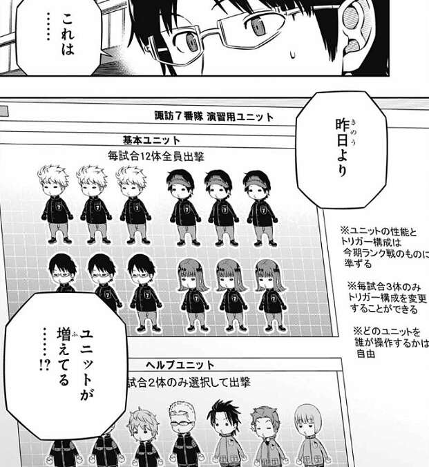 そして場面は諏訪7番隊に移り、諏訪7番隊用の演習用ユニットの説明が書かれているファイルを開くと、昨日より操作する基本ユニットが8体から12体に増えています。ヘルプユニットも2体を選択出来たり、選択できるヘルプユニットが太刀川達から、緑川や嵐山達へと変化したりと、条件が変わっています。