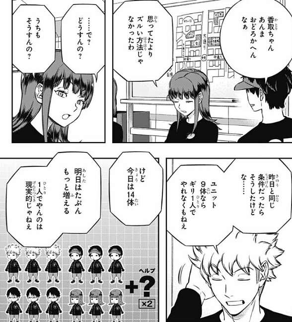 この説明を見た香取は、うわ、なにこれめんど……、だから得点が倍ってわけ?と、つぶやきます。三雲も戦闘シミュ2日目の得点が倍になっている事を思い出し、得点配分の理由に納得します。そして、諏訪は昨日言っていた『俺の予想』を言い、水上9番隊はたぶん戦闘シミュを1人でやっていて、やっているのは荒船か水上のどっちかだろう、という考えを全員に話します。