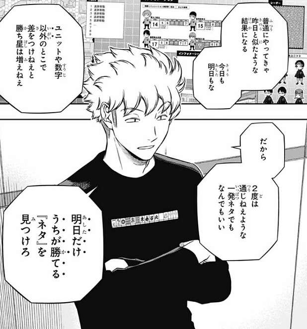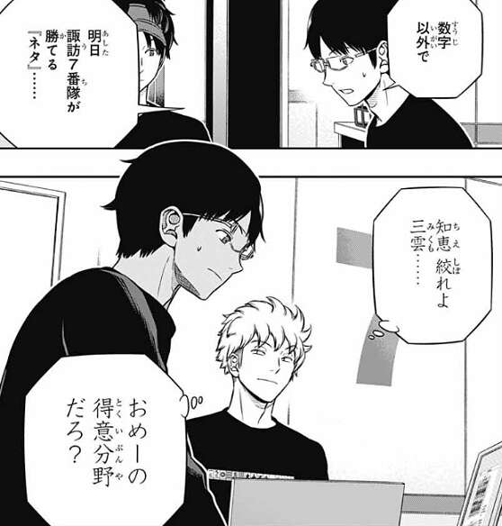 ユニットや数字以外で明日、諏訪7番隊が勝てる『ネタ』と言われ、三雲は考え込みますが、諏訪は、知恵絞れよ三雲……、おめーの得意分野だろ?と、心の中でつぶやき三雲に期待を掛けます。
