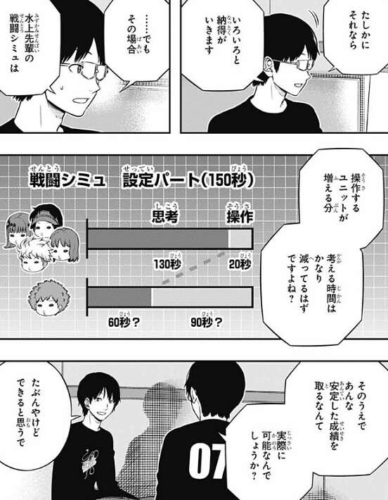 でもその場合、水上は戦闘シミュで操作するユニットが増える分、考える時間はかなり減ってしまい、三雲はあんな安定した成績を取るなんて、実際に可能なんでしょうか?と、疑問を持ちます。しかし、隠岐は水上が昔『奨励会』に居て、将棋の経験があると言い、その将棋での経験が戦闘シミュでも活きている、だからたぶん安定した成績を取ることも出来ると思うで、と隠岐は言います。