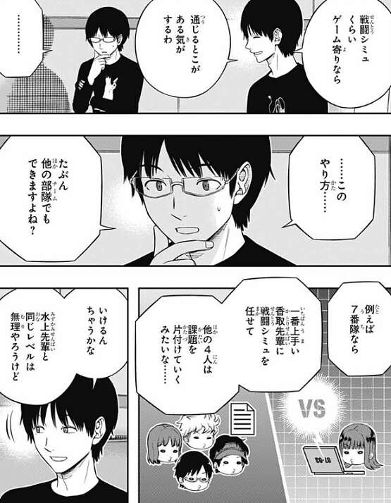 水上本人は、将棋は『ゲーム』でランク戦の戦術とは全然別物と言っていたようですが、隠岐は戦闘シミュくらいゲーム寄りなら、通じるところがある気がする、と三雲に言います。それを聞いた三雲は、このやり方はたぶん他のチームでもできますよね?と、言い、例えば諏訪7番隊なら一番上手い香取に戦闘シミュを任せて、他の4人は課題を片付けていくやり方も出来る、と言います。水上と同じレベルは無理だが、同じやり方は出来ると思う、と隠岐も言うと、だとしたら今日のうちにいろいろ準備した方が良かったんじゃ……、と三雲は隠岐に言います。隠岐は、諏訪は明日まで待てと言っていたし、なんか考えあるっぽいし、まあ明日には全部わかるやろ、と言い、結局三雲と隠岐は諏訪の言うとおり、明日まで待つことにします。