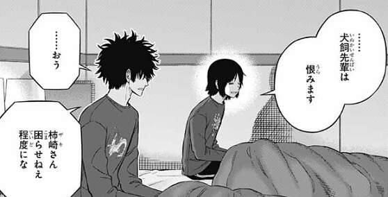 そしてその後、……犬飼先輩は恨みます、と別役がぽつりとつぶやくと、ザキさん困らせねえ程度にな、と影浦は別役に答えます。