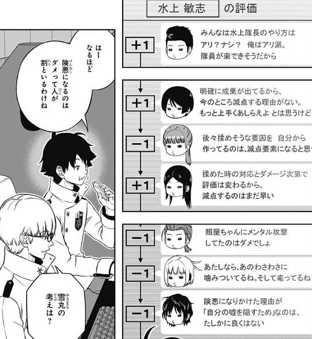 閉鎖環境2日目は終了し、3日目が開始、防衛任務に行っていたA級隊員達が試験の審査に合流します。片桐隊の一条雪丸が、昨日なんかおもしろいことあった?と、聞くと、水上9番隊で水上が隠していたことがバレそうになった件が話題に上がります。そしてこの件に対するA級隊員達の評価を雪丸はチェックしますが、水上への評価はプラスとマイナスに割れる結果になっていました。