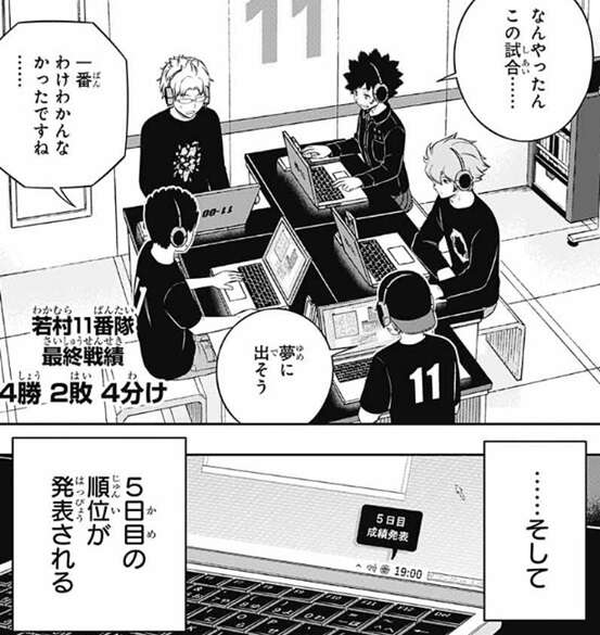 242話が終わった時点で、閉鎖環境試験5日目の試合が全て終了しています。5日目の順位が発表されようとした所で終わっていて、順位はまだ不明です。調子のいい若村隊の最終戦績は4勝2敗4分けで、負けたのは諏訪隊と歌川隊だけです。