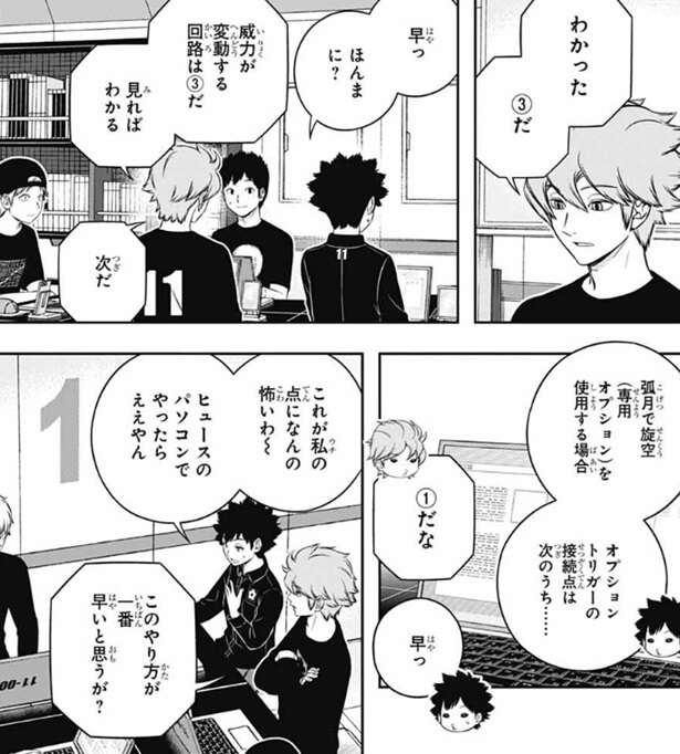 さらにヒュースには共通課題がまだ残っているようですが、大した量じゃない、とヒュースは余裕な様子です。それを見た若村はトリガー関連の分担課題を細井とヒュースに任せて、トリガー以外の一般課題をオレたちでやるぞと言い、13時までは課題優先で、その後特殊シミュの作戦会議を行うとチームメイトに指示します。