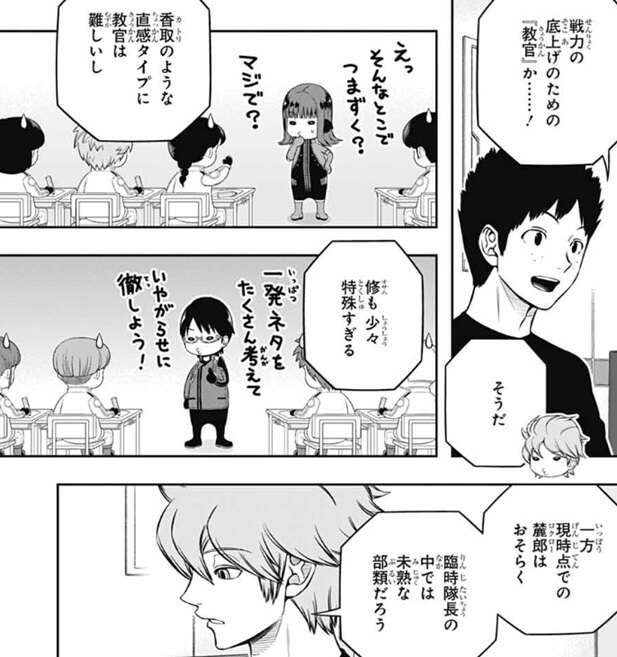 戦力の底上げのための『教官』としては、香取のような直感タイプは難しいとヒュースは言い、三雲も少々特殊過ぎると言います。そして、現時点では若村はおそらく臨時隊長の中では未熟な部類だろうが、この先自分の力で壁を越える経験を積んでいけるとしたら、とヒュースは仮定の話をします。