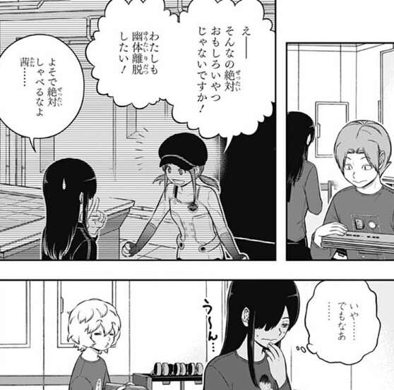志岐は日浦に話した時に、えーそんなの絶対おもしろいやつじゃないですか!私も幽体離脱したい!と、好意的な反応をしていましたが、よそで絶対しゃべるなよと日浦を口止めしていました。空閑にはああ言われましたが、志岐のトラウマは根深いようでどうするか悩んでいます。