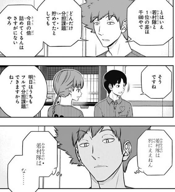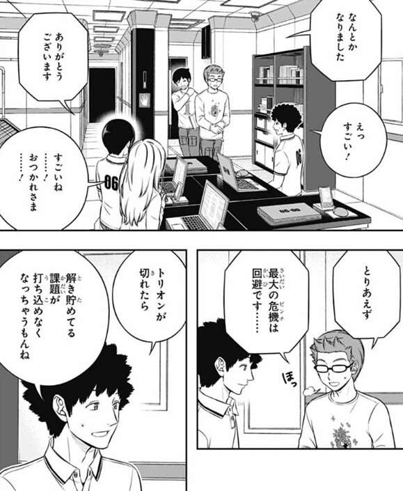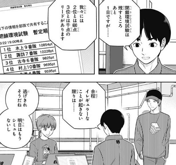 一方、古寺6番隊は古寺がドアを直し、食料庫のドアが開きます。トリオンが切れたら、古寺隊で解き貯めている課題が打ち込めなくなり、古寺隊の作戦が破綻するところでしたが、最大のピンチは回避できたようです。ご飯は六田と木虎が担当することになりますが、古寺は明日は対戦課題がないので純粋に処理能力と戦略の勝負になるはず、唯一不安があるとすれば……、と何かを考えこみます。