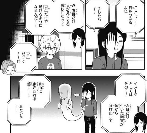 志岐から『幽体離脱』を信じるかと聞かれて、巴は幽体離脱って魂が抜けるやつみたいなやつですか?と、確認しますが、志岐は目をつぶると右目だけ目が見えてる感じになって、『目』だけで動けるようになるんだ……、と具体的なイメージを話し始めます。イメージとしては、右目だけ付いた幽霊が体から抜け出して、自由に歩き回れる感じ……、だそうです。
