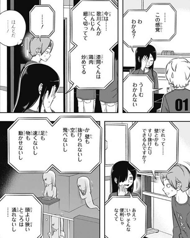 この感覚わかる?と、志岐は空閑に聞きますが、さすがに空閑も幽体離脱の感覚は分からないようで、うーむわかんない、と答えます。しかし、実際に志岐は目をつぶれば離れている場所のことが分かるようで、キッチンで歌川が人参を細く切っていて、漆間が鶏肉を炒めている事を言い当てます。ただ制限も多いようで、壁は抜けられず、空も飛べず、足も速くないし、物も動かせず、頭より狭い所は通れないそうです。ここまで話して、……って信じられないよね……こんなの、うさんくさくて……、と志岐は自信なさげに言いますが、他人の嘘を見抜くサイドエフェクトを持っている空閑は自信をもって、信じるよ、さよこ先輩がウソ言ってないのはわかる、と断言します。そして、志岐は小学生の頃にこの話をしたら、クラスメイトから嘘つきと言われたエピソードを話し始めます。