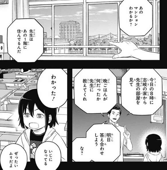 幽体離脱が出来ると言う小学生の志岐に対して、クラスメイトからぜったいウソだと言われてしまいます。困った先生は自分の住んでいるマンションを指さして、先生はあの1階に住んでいるから、今日の8時に志岐の家から先生の部屋を見て、晩ごはんが何だったか先生に教えてくれ、と言います。明日答え合わせすることになり、小学生の志岐は、わかった!と、言いますが、クラスメイトからは、いじになってる、ぜったいムリだよ、と言われ状況は変わりません。