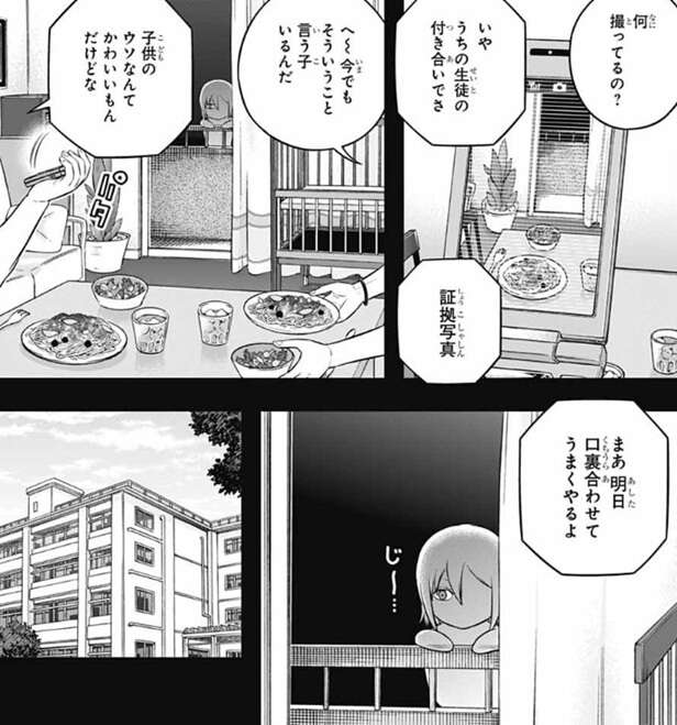 そして、先生は8時に晩ごはんを写メで撮りますが、先生も相手の女性も志岐がウソを言っていると思っています。先生は、明日口裏合わせてうまくやるよ、と軽口を叩いていますが、この部屋は1階なのでベランダには幽体離脱した志岐がいて、先生と女性が晩ごはんを食べている所をじーッと見ていました。