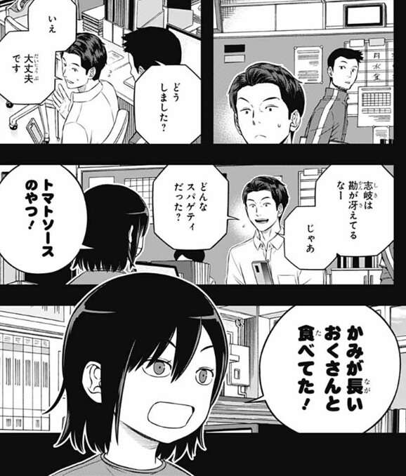 翌日、小学生の志岐は先生の昨日の晩ごはんをスパゲティと言い当てます。驚いた先生は志岐は勘が冴えてるなーと言い、どんなスパゲティだったかさらに質問しますが、トマトソースのやつで、髪が長い奥さんと食べていたと言い当てます。
