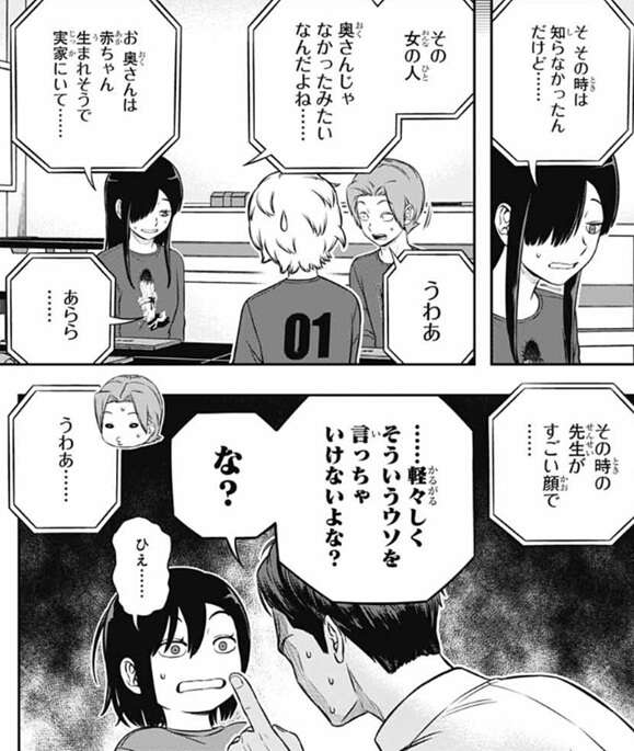 しかしこれが先生としてはまずかったようで、実は相手の女の人は奥さんではなく、奥さんは赤ちゃんが生まれそうで実家に帰っていたそうです。その時の先生がすごい顔で小学生の志岐に、……軽々しくそういうウソを言っちゃいけないよな?な?と、小学生の志岐がウソを言った事に強引にしたようです。その表情を見て、小学生の志岐は、ひえ……、とドン引きしています。