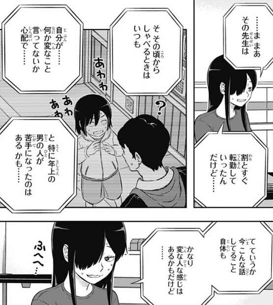 結局、その不倫していた先生は割とすぐに転勤したそうですが、その頃から志岐は喋る時はいつも何か変な事を言っていないか心配するそうになったそうです。特に年上の男性が苦手になったようですが、志岐先輩は全然悪くないですよ、ただの巻き込まれですよ、と巴は志岐は悪くないと言い、空閑も同意します。