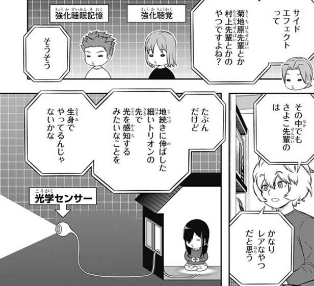 さらに空閑は志岐のサイドエフェクト、滅茶苦茶便利そうと言います。空閑は志岐の幽体離脱がサイドエフェクトだと言い、サイドエフェクトの中でもかなりレアなやつで地続きに伸ばした細いトリオンの先で光を感知するみたいなことを、生身でやってるんじゃないかな、と志岐のサイドエフェクトを推測します。