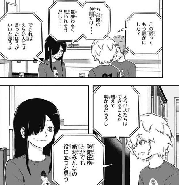 さらに志岐がチームの仲間だけにしか言っていない、気味悪く思われそうだし……、と言うと、空閑は出来れば偉い人には言った方がいいと思うよ、とアドバイスします。偉い人たちには出来る事が増えて助かるだろうし、防衛任務とかでも絶対みんなの役に立つと思う、と空閑が言った所で、もうちょっとでメシだぞ、と漆間が言い会話は終わります。