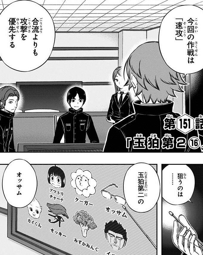 独特な感性を持っている王子隊の王子一彰ですが、今回は三雲が狙われそうです。しかし空閑達は三雲が集中攻撃される可能性を認識しつつ、作戦を立てます。