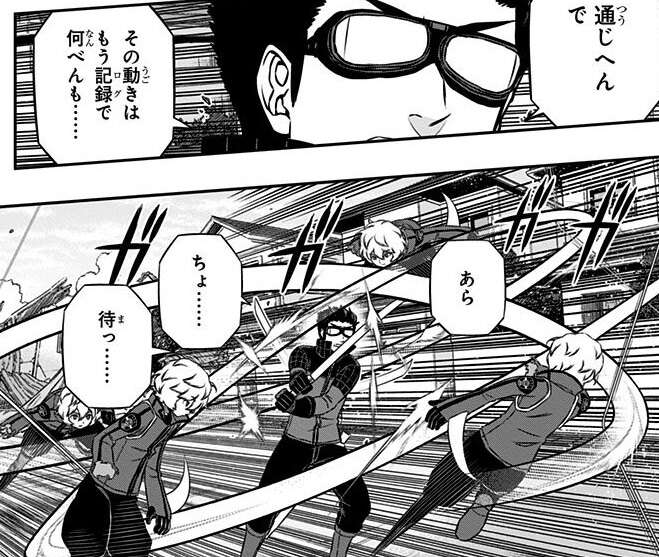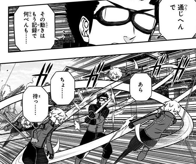 生駒隊の生駒が伸びる弧月「生駒旋空」で空閑を斬ろうとしますが、空閑は何とかかわします。その後生駒隊と王子隊が戦闘し始めますが、空閑は生駒隊と王子隊の戦闘の隙をついて王子隊の蔵内を倒し、ポイントを取ります。